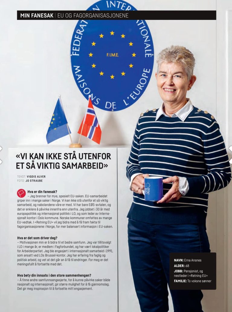 Retning EUS nestleder Erna Ansnes, har blitt intervjuet av Fagbladet. Hennes fanesak: EU og fagorganisasjonene, les intervjuet….